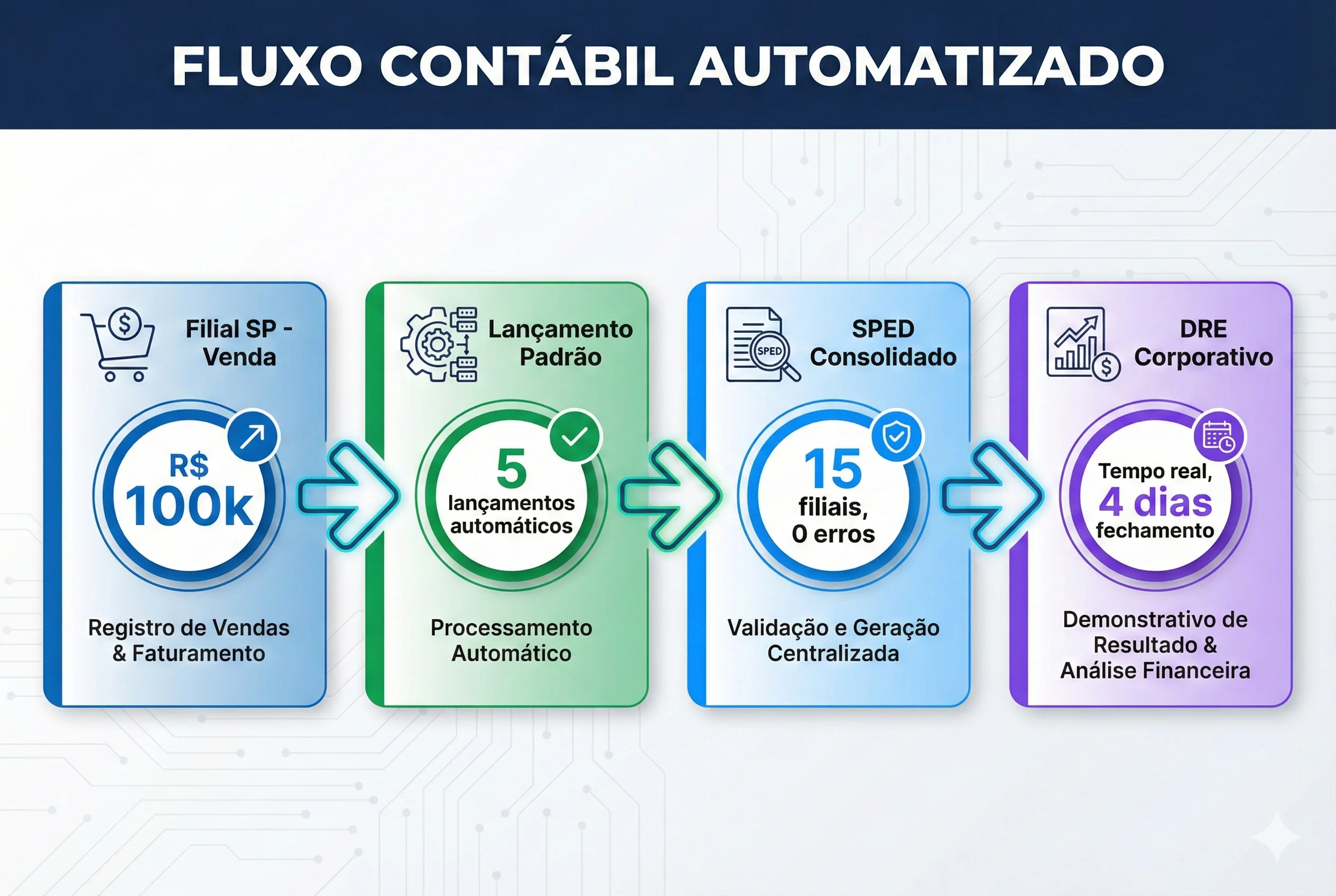 Dia 10 do mês. Sua equipe contábil está em modo guerra. 15 filiais, 7 estados diferentes, 3 regimes tributários, e o fechamento precisa acontecer ONTEM. A controladora ligando a cada hora. E você, gerente contábil, tentando consolidar DREs que não fecham por causa de "divergências de conciliação" que ninguém sabe explicar.
